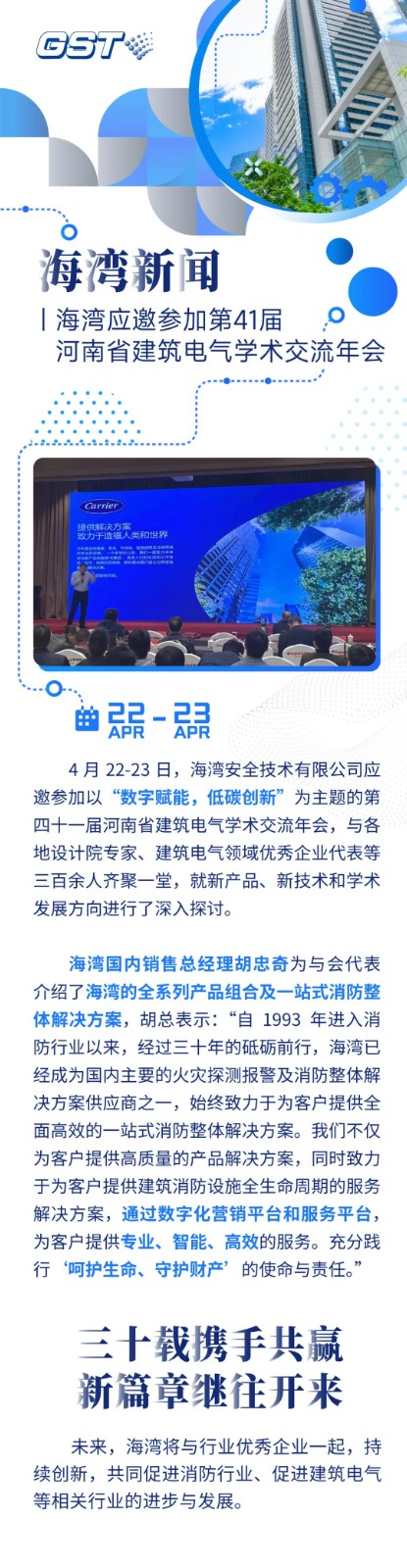 4 月 22-23 日,天津天津天津海灣安全技術(shù)有限公司應(yīng)邀參加以“數(shù)字賦能,低碳創(chuàng)新”為主題的第四十一屆河南省建筑電氣學(xué)術(shù)交流年會(huì),與各地設(shè)計(jì)院專(zhuān)家、建筑電氣領(lǐng)域 企業(yè)代表等三百余人齊聚一堂,就新產(chǎn)品、新技術(shù)和學(xué)術(shù)發(fā)展方向進(jìn)行了深入探討。